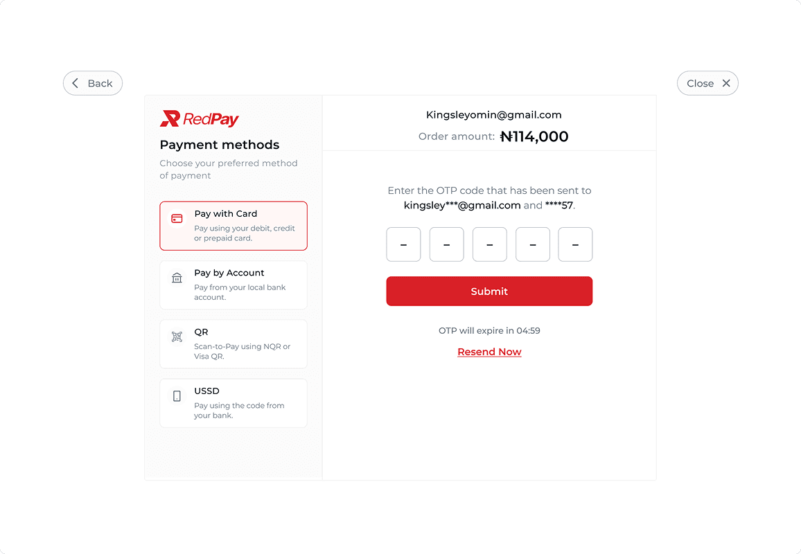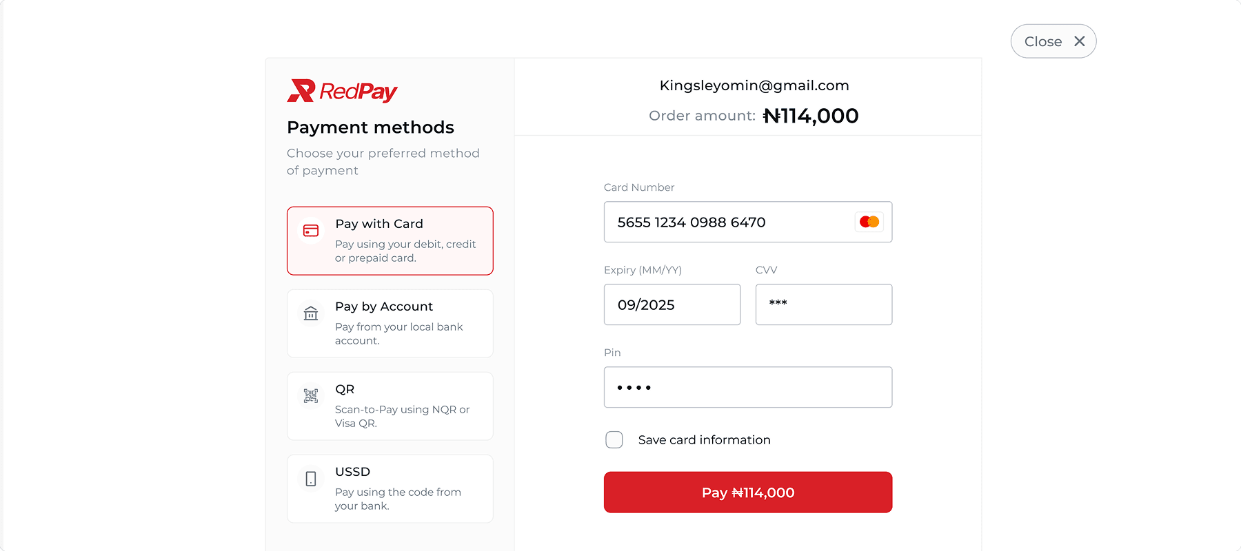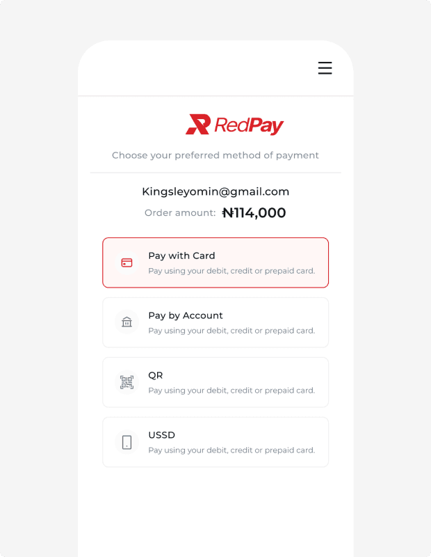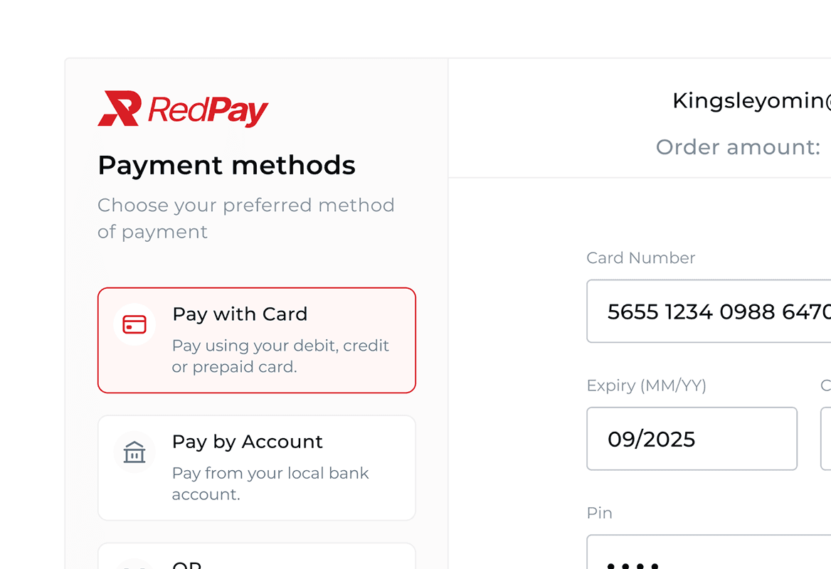RedPay is a subsidiary of Heirs Holdings under the UBA Group. It powers secure digital payments for online transactions across Africa. My role was to design a clean and intuitive payment interface that allows users to complete transactions quickly across multiple payment methods including card, bank transfer, QR code and USSD. Timeline: 3 weeks Role: Product Designer Platform: Checkout UI for web Tools: Figma